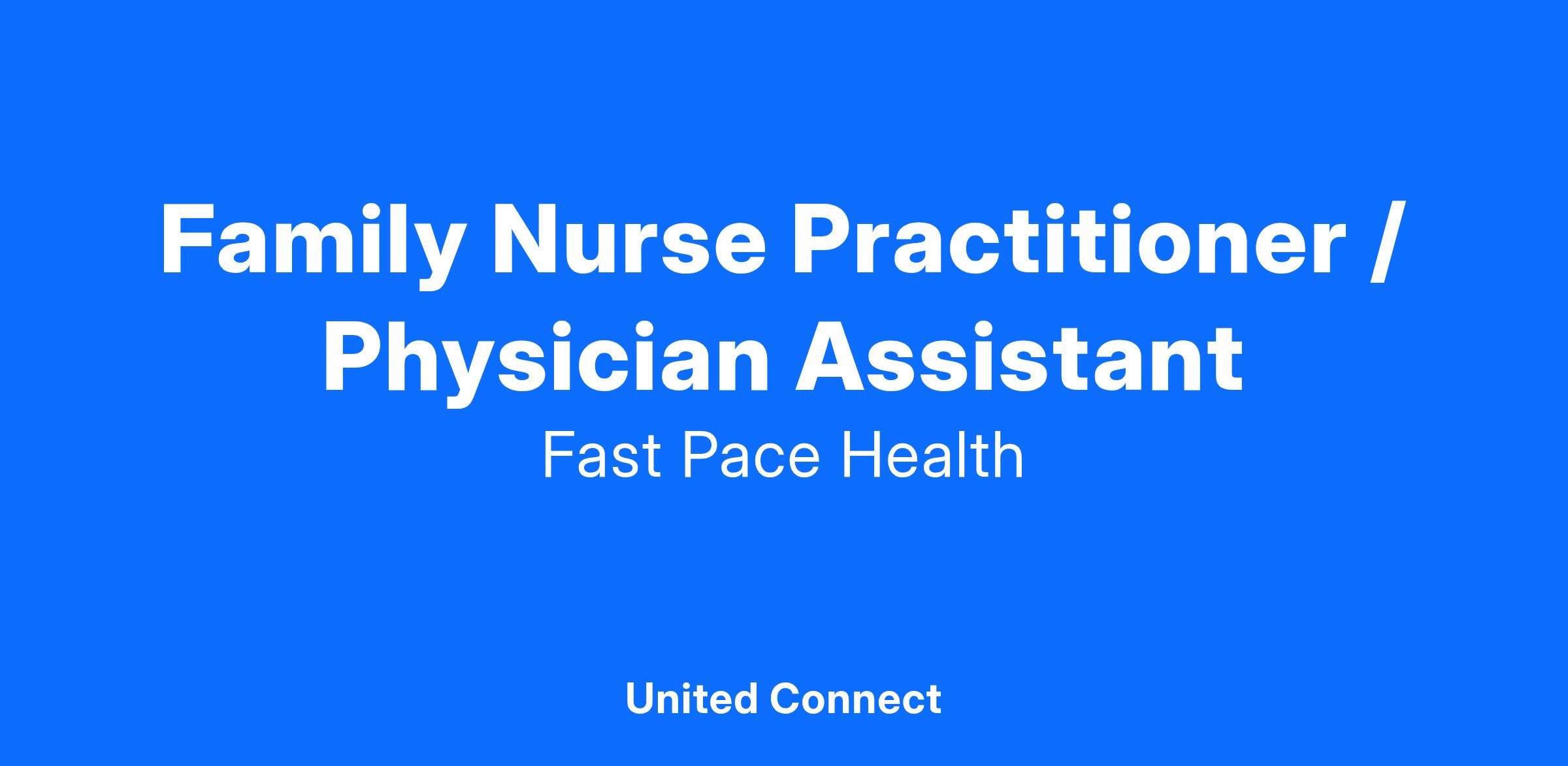 Fast Pace Health strives to provide a best in class patient experience in every interaction. We are seeking a highly-skilled, experienced Family Nurse Practitioner to join our growing team. Our ideal candidate will be deeply committed to nurturing our Fast Pace mission of teamwork, communication, empowerment and quality care in a friendly and encouraging environment.