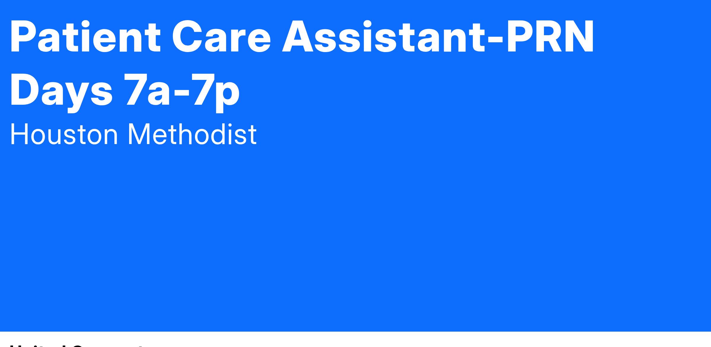 At Houston Methodist, the Patient Care Assistant (PCA) position is responsible for functioning as novice to competent and demonstrates basic knowledge and skills necessary to communicate appropriately and carry out delegated nursing assistant level tasks for assigned age-specific, diverse patient population, assisting in the delivery of patient care and services under the supervision of a licensed nurse. This position conducts hourly rounding to ensure patient needs are met and records data established by policy and procedure, and reports observations and patient problems to the licensed nurse. The PCA position performs basic patient care activities of daily living (ADL's) within unit-specific defined limits and job scope, such as assistance with patient elimination, hygiene, comfort, safety, nutrition, and progress activity and practices Patient and Family Centered Care in concert with Houston Methodist ICARE values.