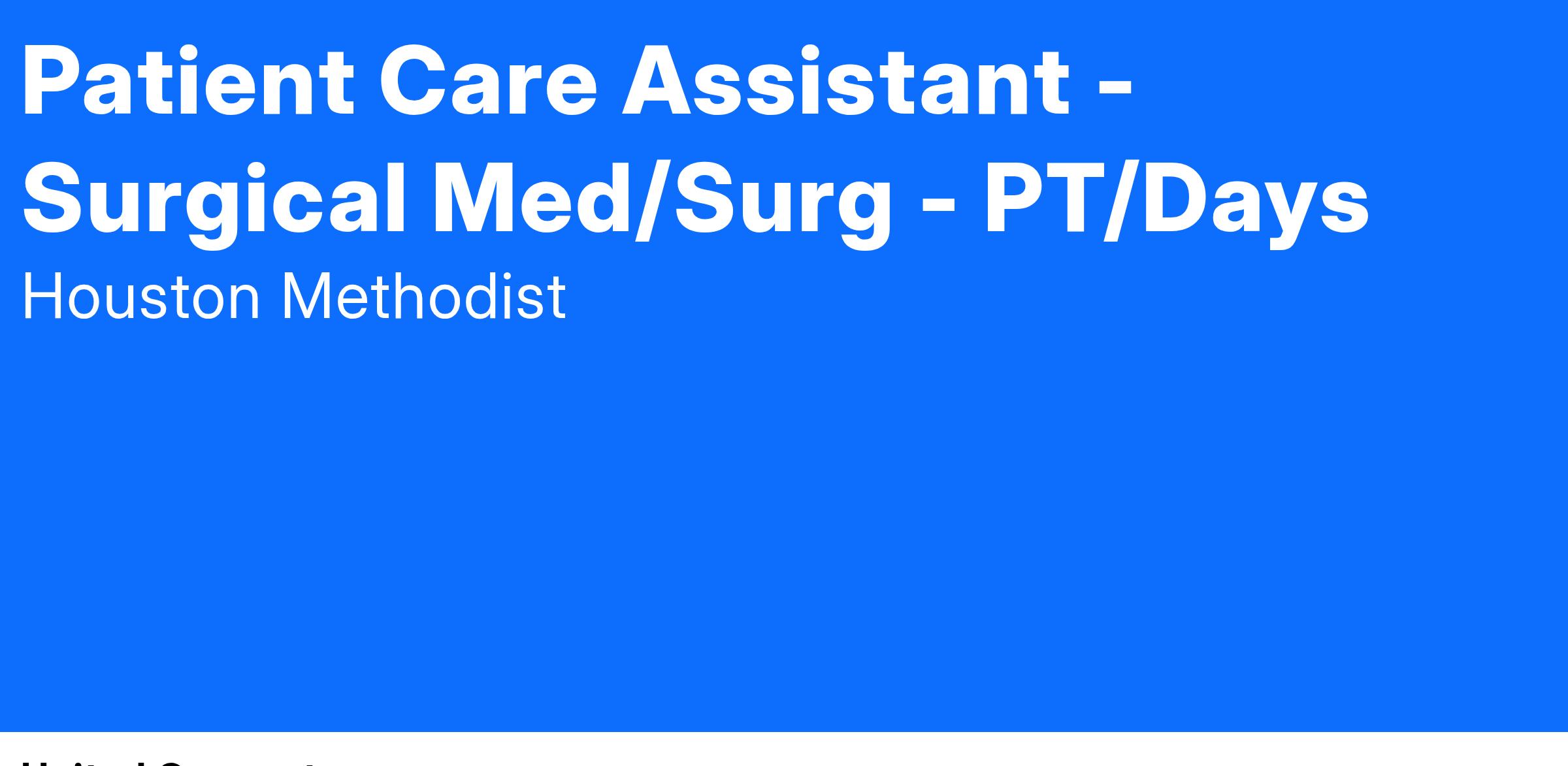 At Houston Methodist, the Patient Care Assistant (PCA) position is responsible for functioning as novice to competent and demonstrates basic knowledge and skills necessary to communicate appropriately and carry out delegated nursing assistant level tasks for assigned age-specific, diverse patient population, assisting in the delivery of patient care and services under the supervision of a licensed nurse. This position conducts hourly rounding to ensure patient needs are met and records data established by policy and procedure, and reports observations and patient problems to the licensed nurse. The PCA position performs basic patient care activities of daily living (ADL's) within unit-specific defined limits and job scope, such as assistance with patient elimination, hygiene, comfort, safety, nutrition, and progress activity and practices Patient and Family Centered Care in concert with Houston Methodist ICARE values.