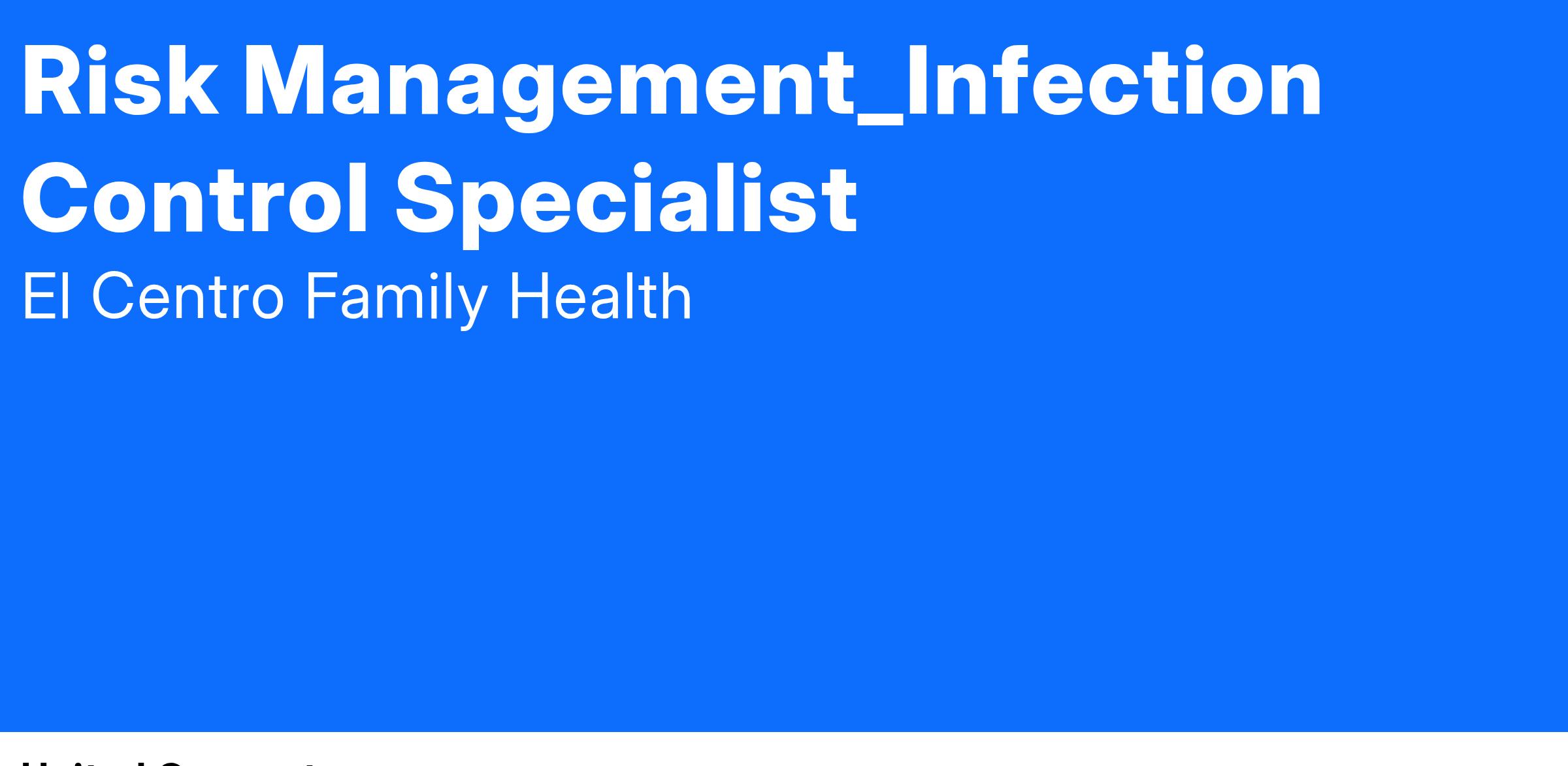 Under the supervision and direction of the Chief Clinical Officer (CCO), the Risk Management/Infection Control Specialist promotes El Centro Family Health (ECFH) to its patients, customers and public with relations that are consistent with the organization's mission, vision and overall goals and objectives. The Risk Management/Infection Control Specialist oversees Compliance, Risk Management activities and is responsible for organization-wide infection prevention/control and safety program. As Infection Control Support Specialist performs a variety of specialized clerical and technical duties. The purpose is to ensure that we have procedures and policies consistent with preventing the spread of infection.
