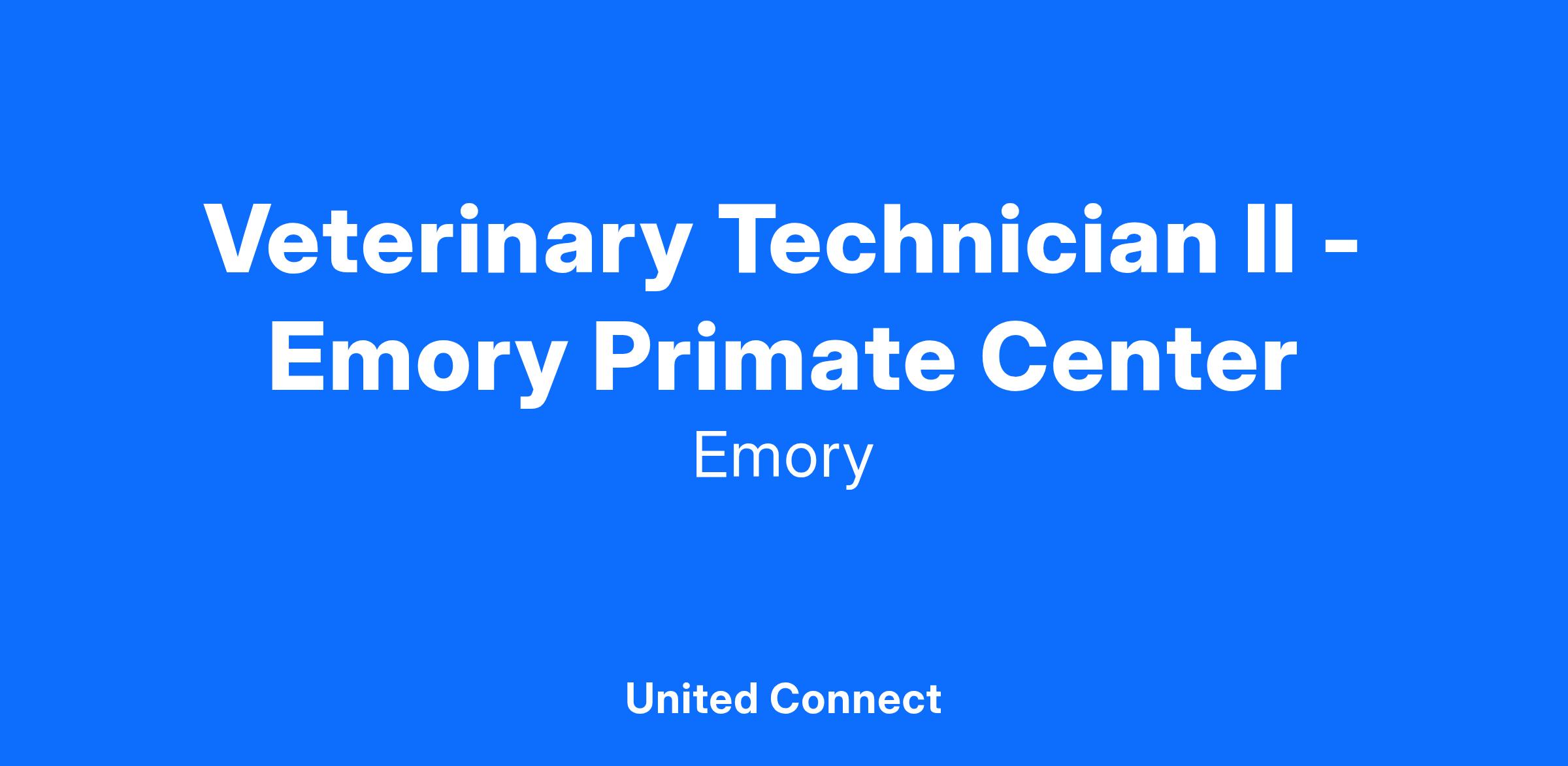 The Division of Veterinary Medicine within the Emory National Primate Research Center at Emory University is currently seeking a highly motivated, highly skilled, qualified veterinary technician to join our team at our busy Main Station in the position of Veterinary Technician II. This role functions with a great deal of autonomy and responsibility; solid technical skills, sound judgment, excellent communication skills, a positive attitude and the ability to work both independently and with a team are required. The successful candidate will have demonstrated knowledge and skill in recognizing the appearance of abnormal health conditions and providing basic veterinary care to animals, especially nonhuman primates and rodents, used in biomedical research.